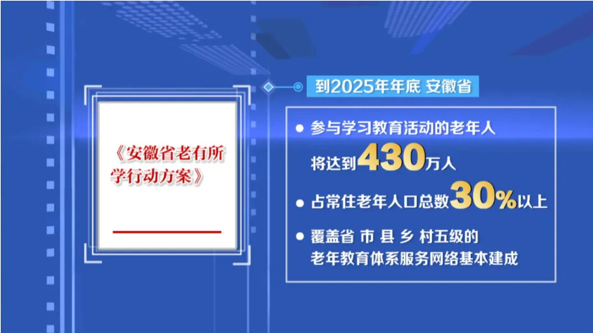 眼下,安徽正着力绘就“老有所学”新图景,不断延伸老年教育的“幸福半径”。根据安徽省《老有所学行动方案》,到今年年底,全省参与学习教育活动的老年人将达到430万人,占常住老年人口总数30%以上。覆盖省、市、县、乡、村五级的老年教育体系服务网络基本建成。围绕“学得好”这一目标,安徽持续加强教学与管理队伍、课程与教学资源、示范校建设及智慧老年教育等工作,全方位提升老年学校办学水平。
