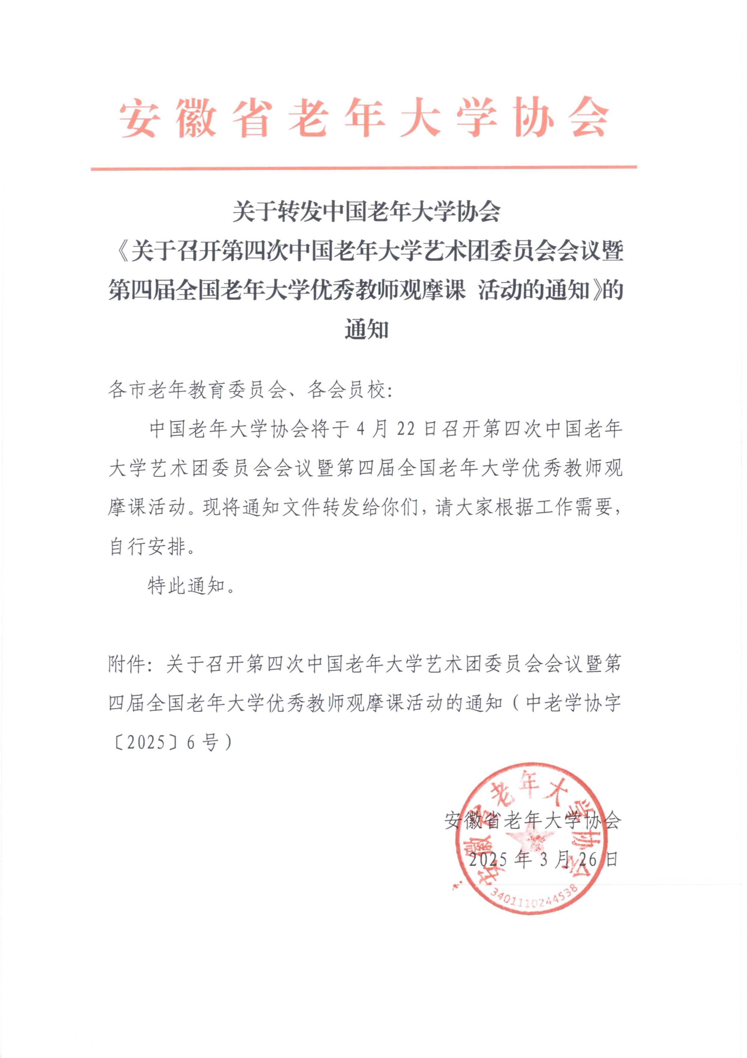 关于转发中国老年大学协会《关于召开第四次中国老年大学艺术团委员会会议暨第四届全国老年大学优秀教师观摩课 活动的通知》的通知