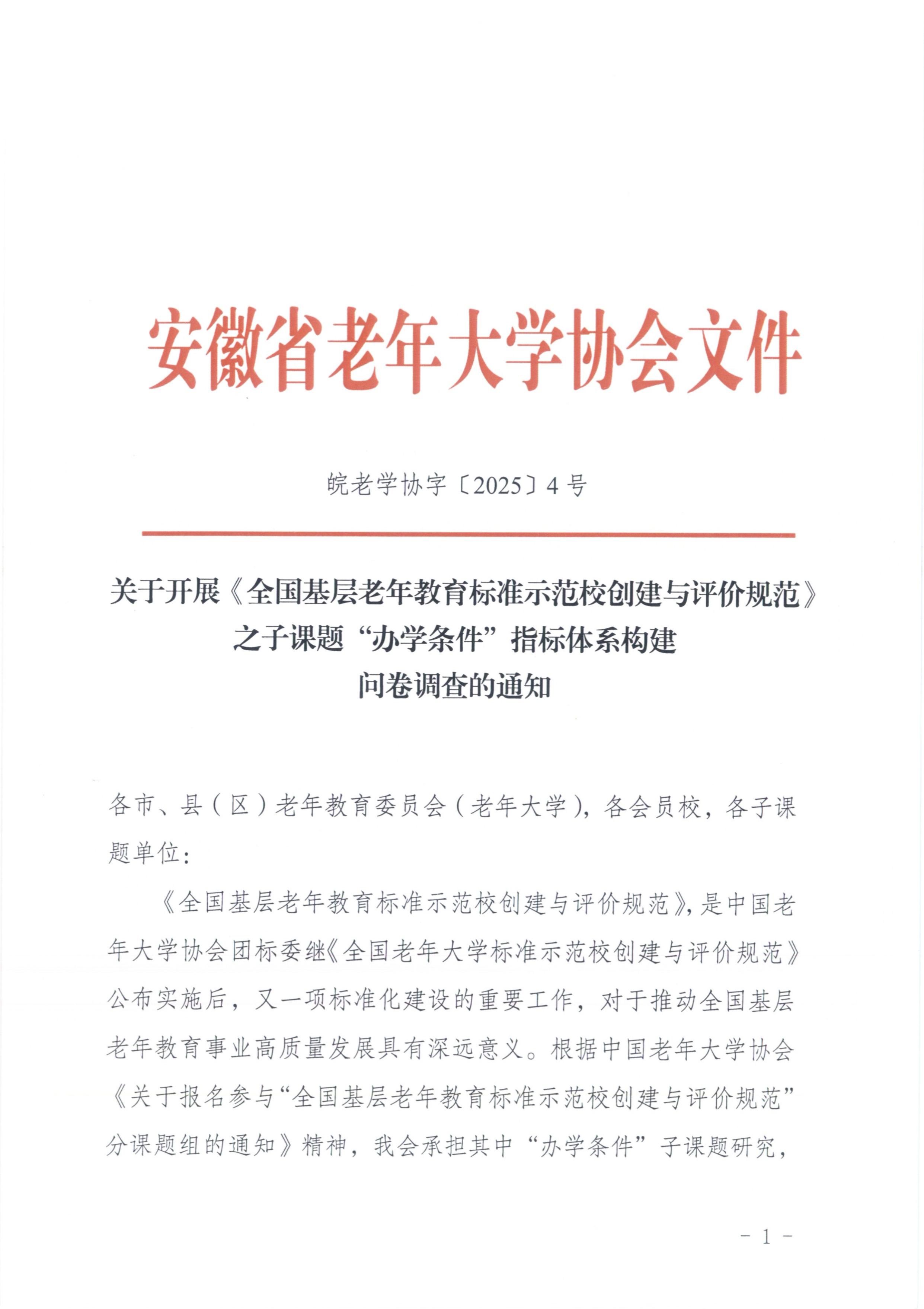 4号文 关于开展《全国基层老年教育标准示范校创建与评价规范》之子课题“办学条件”指标体系构建问卷调查的通知.pdf