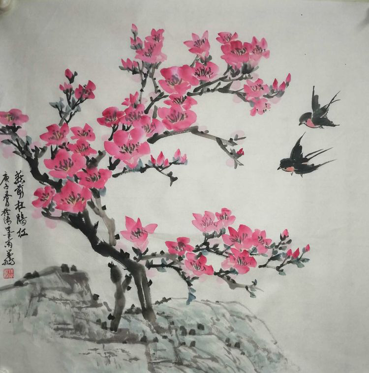 国画:燕剪杜鹃红