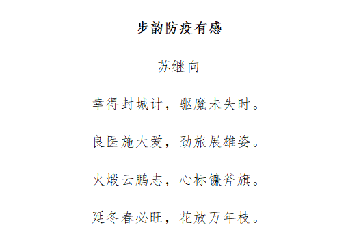 火雷山外搭方仓。助资材,配良方。力挽狂澜,肺疫迹无藏。送暖和风舒且旺,同克难,颂歌扬。